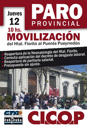 Este jueves 12/11 y en el marco del paro provincial resuelto por el Congreso de CICOP, los trabajadores vuelven a cortar Avenida Belgrano frente al hospital, para marchar después hacia el Puente Pueyrredón. Invitamos a participar con fuerza de esta nueva acción y a seguir en la calle hasta derrotar el ajuste. Desde el MST, expresamos todo nuestro apoyo a esta justa lucha.