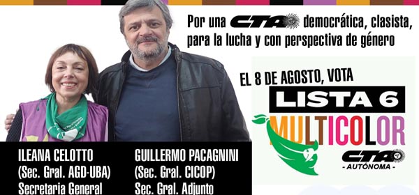Que la CTA apoye y contribuya al desarrollo de una gran alternativa política de unidad de toda la izquierda, anticapitalista y socialista. - Convocamos a todos los sectores críticos al rumbo actual, a lxs luchadorxs con los que compartimos los conflictos del estado, la docencia y de la salud, a votar por la Lista 6 Multicolor.